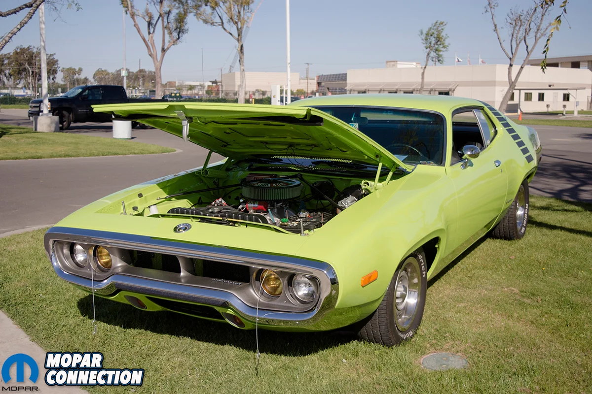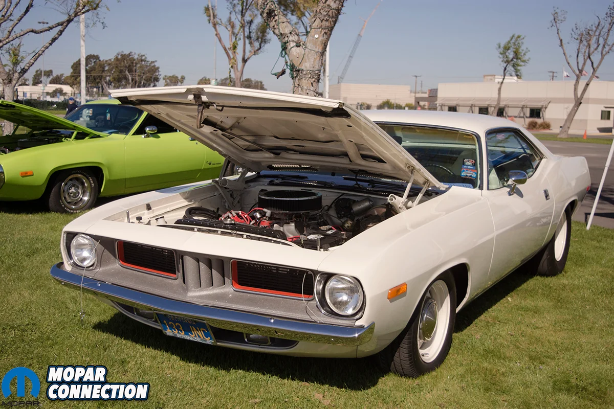 Outside, only a small amount of Mopars could be seen on display. Cars ranged from 1950s, all the way up to 1971. The oldest Mopar parked outside was a 1955 Chrysler Windsor, painted in Porcelain Green, with a Platinum top. Nearby was a Cream 1967 Dodge Charger and a 1962 Plymouth Sport Fury, finished in a red metallic, unlike the original color, which would have been Cherry Red. Near the entrance were two Plymouth Barracudas, a 1970 model painted in Alpine White, and a 1971 model painted in black. Additionally, a Sublime Green 1971 Road Runner was also spotted.