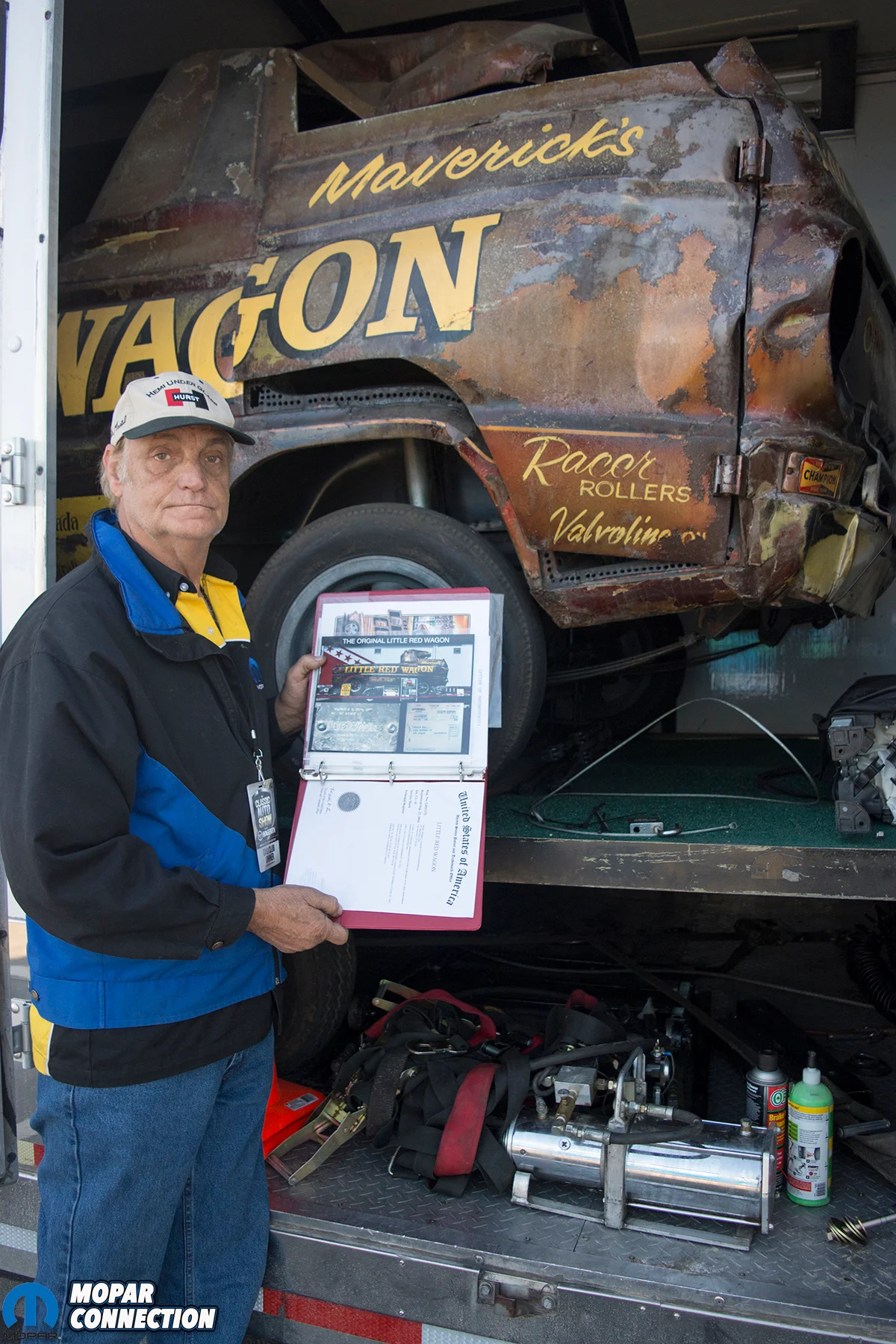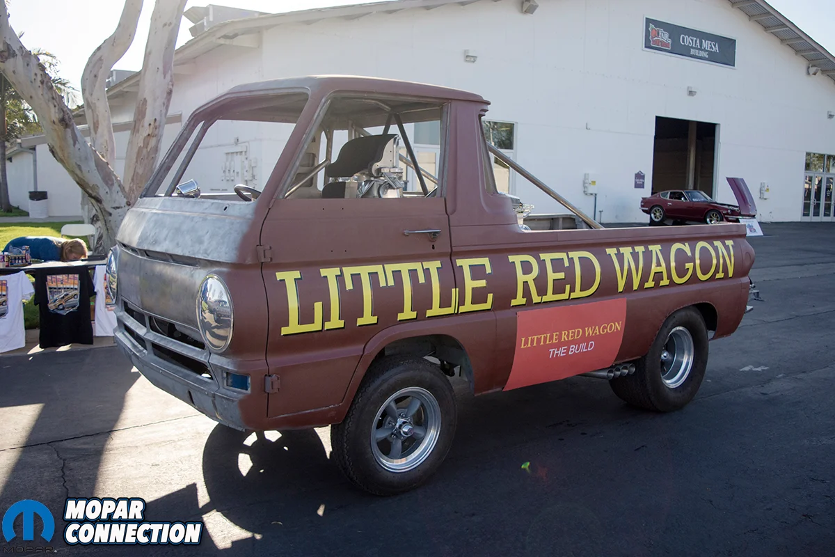 A Certificate of Authenticity states that the unit, number 116, was purchased; by Dick Brantster, who also owned the Color Me Gone, driven by Roger Lindamood. Jay Howell was later enlisted to drive the Little Red Wagon, until being replaced by Bill “Maverick” Golden. Eventually, the Little Red Wagon was heavily damaged in a crash in 1975, and sat outside for many, many years. Mike Mantel acquired this piece of Mopar history in 2015, and continues to tour with it.