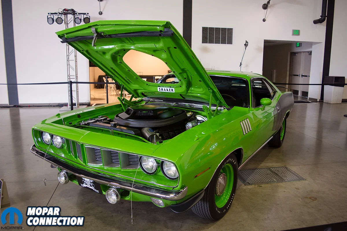 Parked in the Hangar booth were two examples of classic Resto-Mod Mopars, brought in by Mopar enthusiast Mark Worman, of Graveyard Carz. Worman brought in a beautiful 1971 Plymouth Barracuda finished in Sassy Grass Green, which was one of Mopar’s High-Impact colors of the early 1970s. Other examples of High-Impact colors included Panther Pink, Vitamin C Orange, and Tor-Red. Sitting underneath the Barracuda’s hood, was a modern Chrysler 392 Hemi V8. Adjacent to Worman’s Barracuda was a Dodge A-100 pickup truck that was dubbed the Little Dead Wagon. This A-100 is a tip of the hat to the famous Little Red Wagon wheelstander, which was driven by the late Bill “Maverick” Golden.