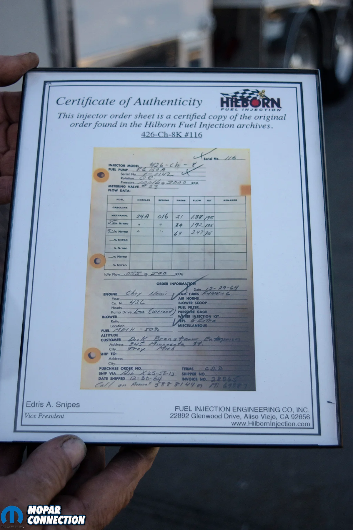 The original Little Red Wagon is still in original condition, having been wrecked in 1975. Mike explained that he has no plans for a restoration, but it can be done if he wanted to. The original Little Red Wagon still retains its original magnesium American Racing Torq Thrust wheels from the 1960s. Another artifact from this incredible piece of Mopar history, was the original Hilborn injection for the 426 Hemi, complete with the eight injector stacks that were on the car.